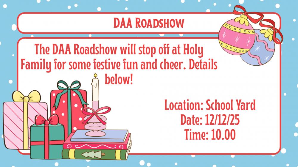 Holy Family JNS was filled with magic and excitement during the DAA Christmas Roadshow visit. Children danced and laughed with Jack Frost, the lively elves, and the K-pop Demon Hunters characters, who brought electrifying fun to the stage. The highlight of the day was Santa himself—arriving with festive cheer and surprising everyone with an impressive backflip! It was a memorable celebration that lit up the school with joy. A huge thank-you to the DAA team for an unforgettable show, and well done to all the children for their wonderful behaviour and enthusiastic participation throughout the entire event. Click here for pictures!